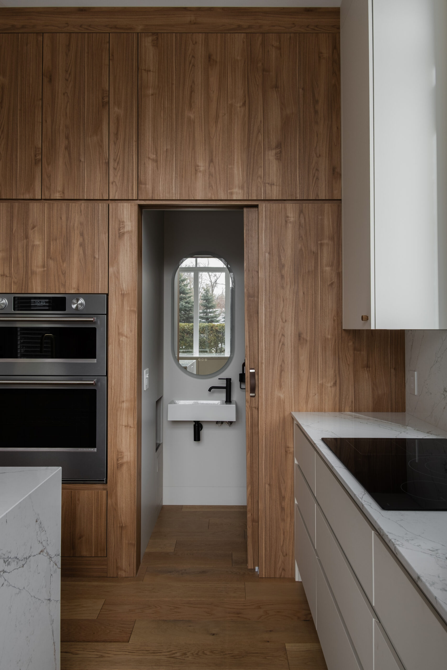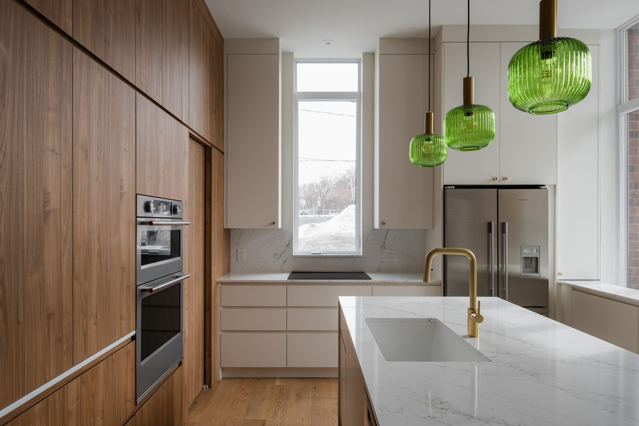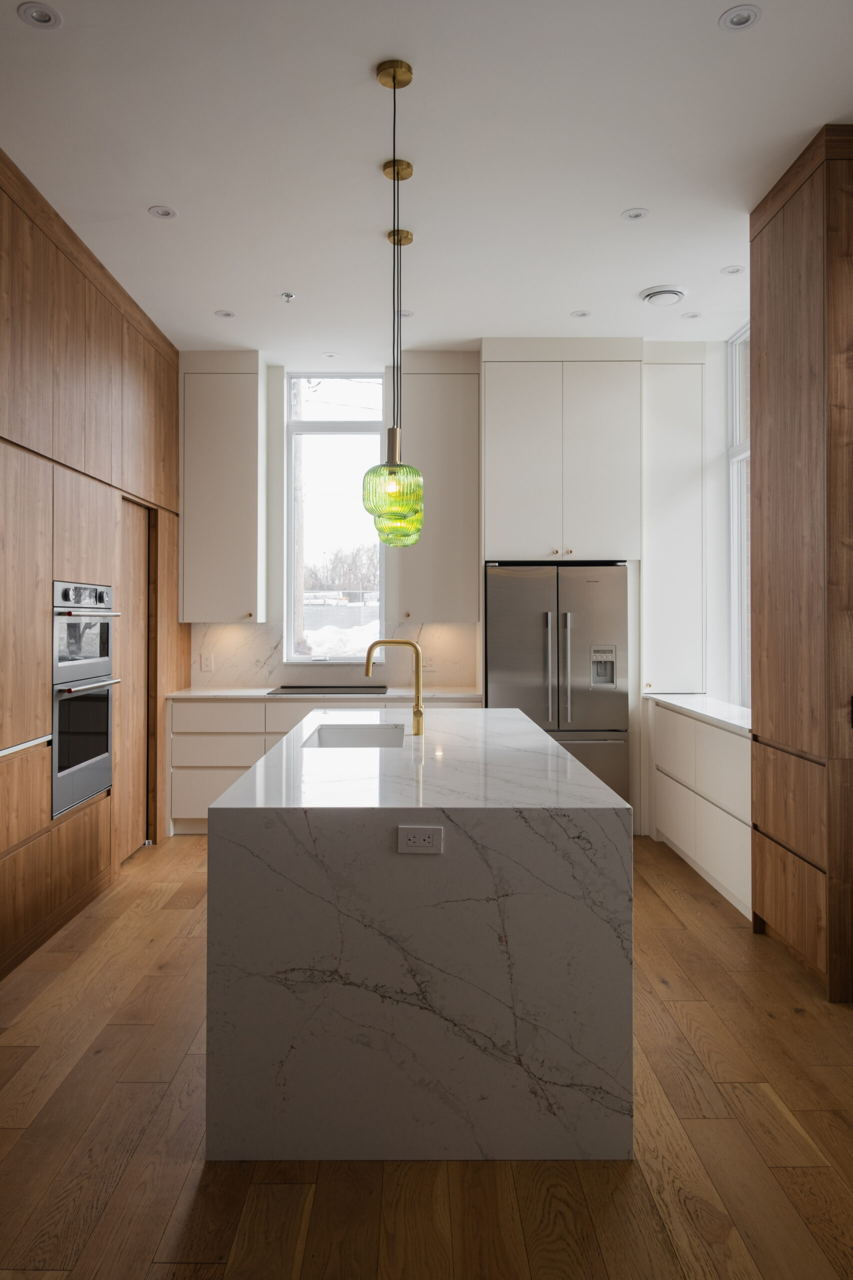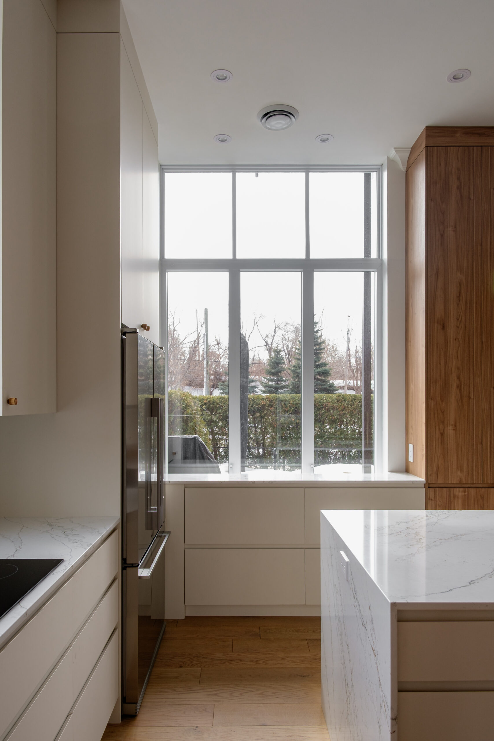 Nous avons entièrement repensé et intégré de façon discrète l’espace cuisine, l’espace salle d’eau et le coin salle de lavage de ce condo afin d’en révéler la pleine volumétrie. Guidées par la hauteur des plafonds et la lumière naturelle, notre conception met en valeur les proportions de cet espace situé dans une ancienne usine à stylos plume, aujourd’hui transformée en condos spacieux. L’ergonomie a été optimisée afin de créer un concept distinctif pour un jeune couple s’installant dans ce quartier animé de Saint-Lambert.