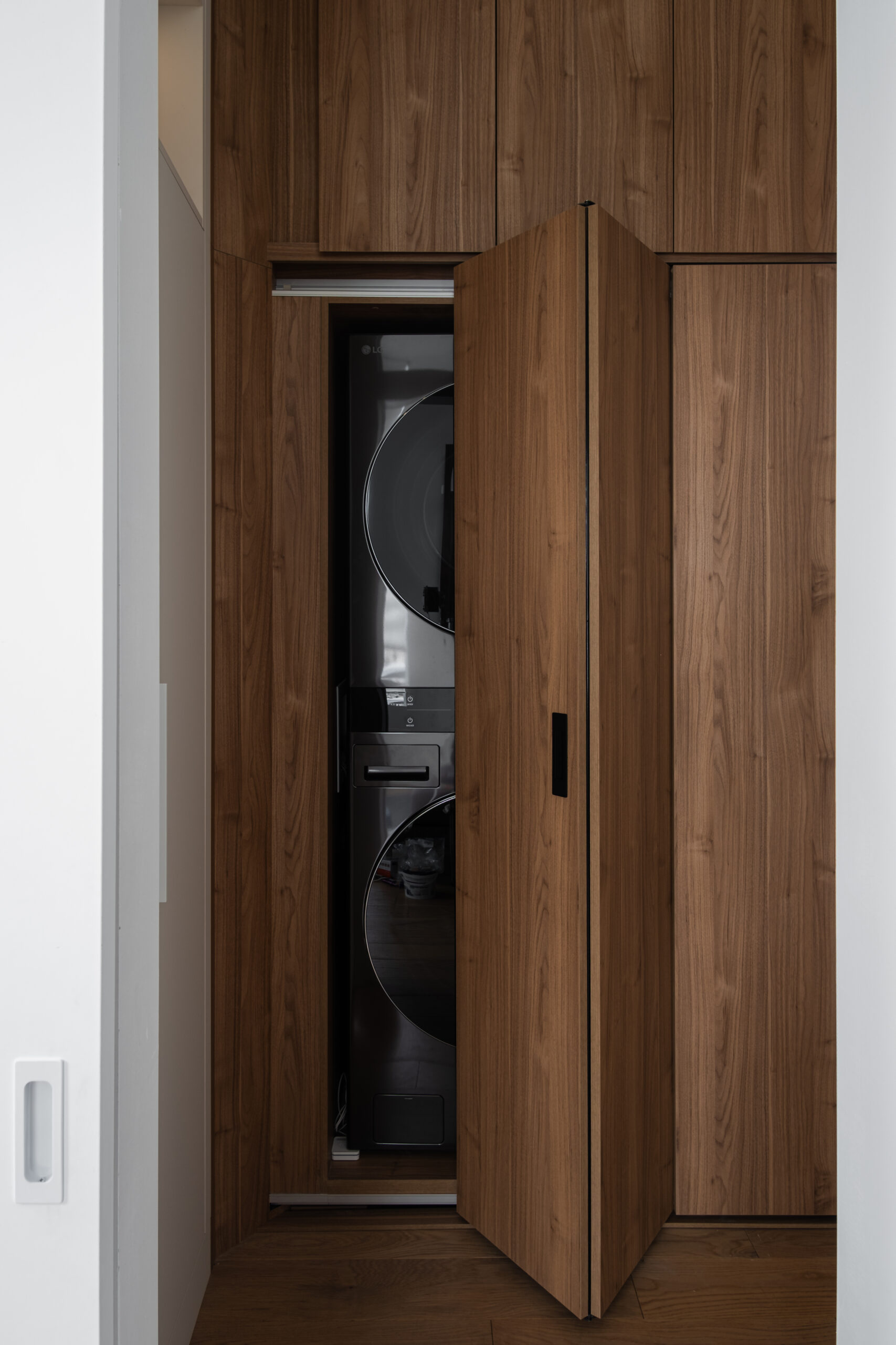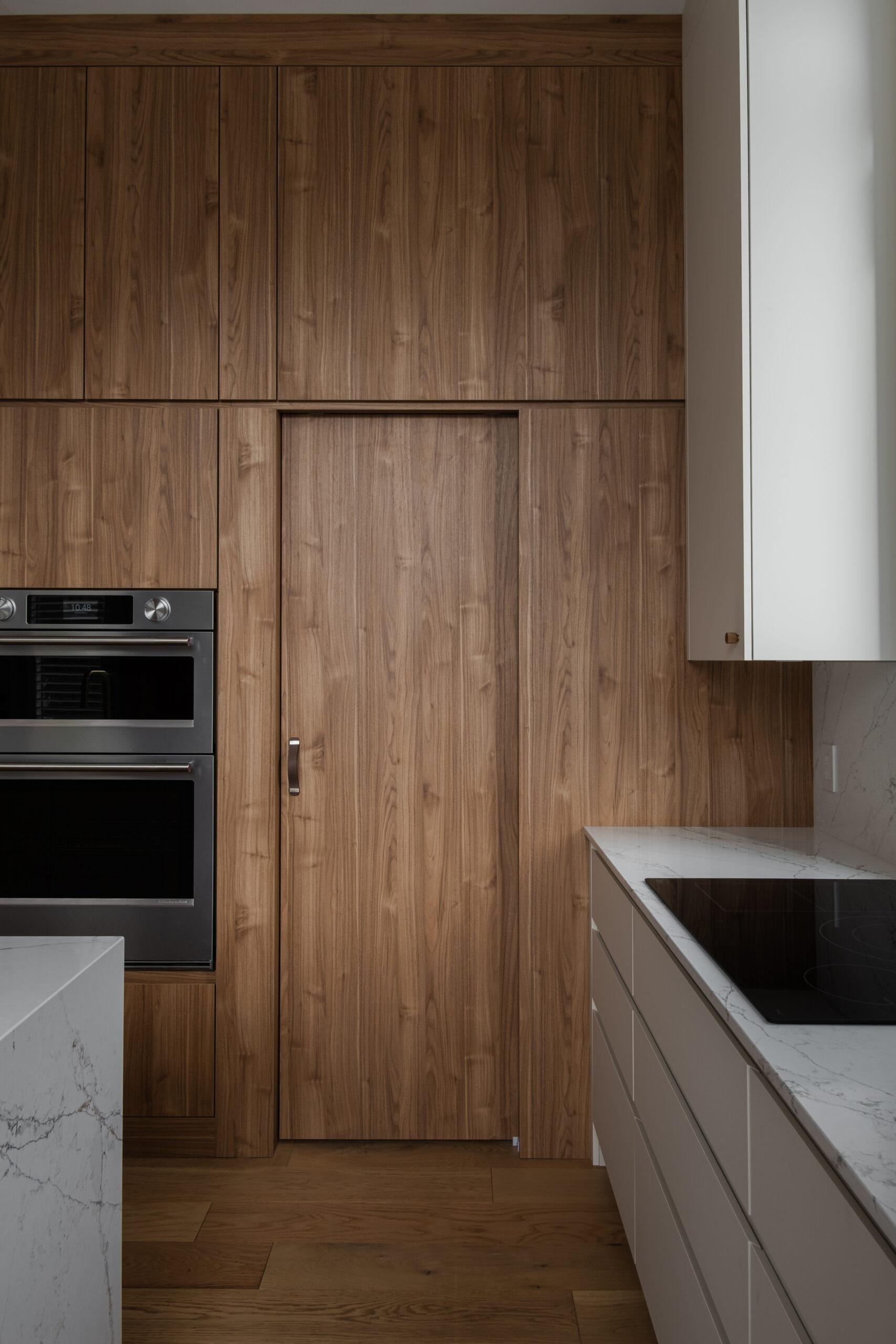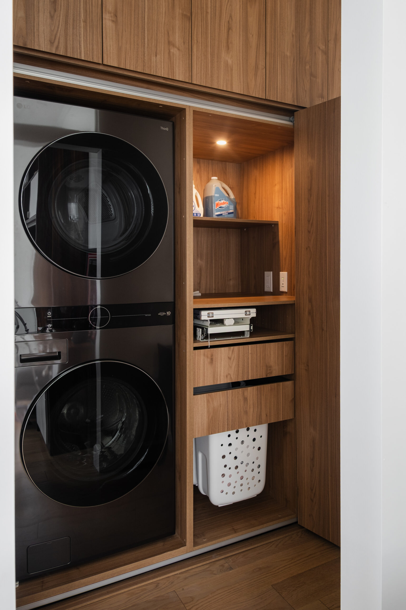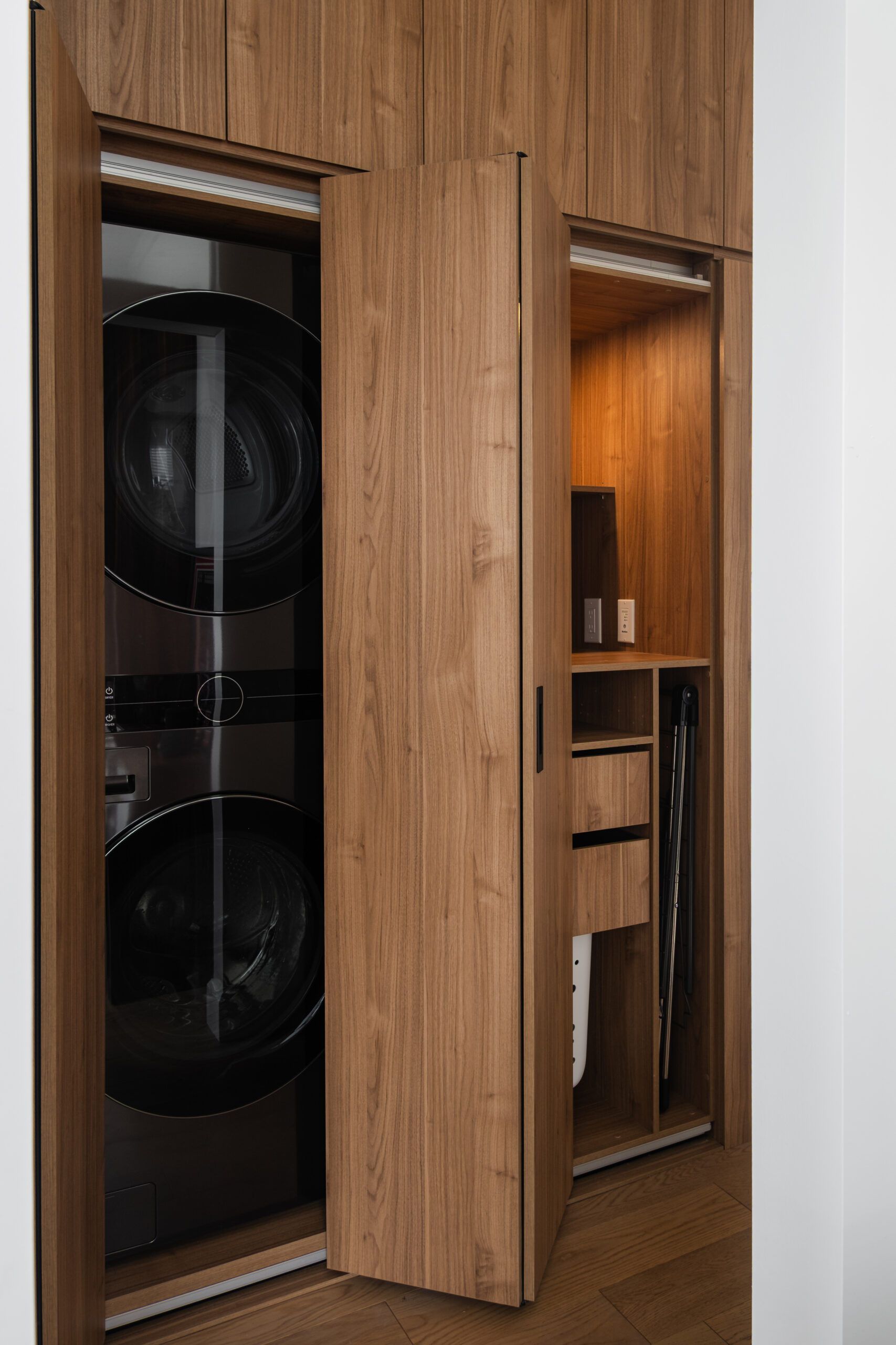 Nous avons entièrement repensé et intégré de façon discrète l’espace cuisine, l’espace salle d’eau et le coin salle de lavage de ce condo afin d’en révéler la pleine volumétrie. Guidées par la hauteur des plafonds et la lumière naturelle, notre conception met en valeur les proportions de cet espace situé dans une ancienne usine à stylos plume, aujourd’hui transformée en condos spacieux. L’ergonomie a été optimisée afin de créer un concept distinctif pour un jeune couple s’installant dans ce quartier animé de Saint-Lambert.