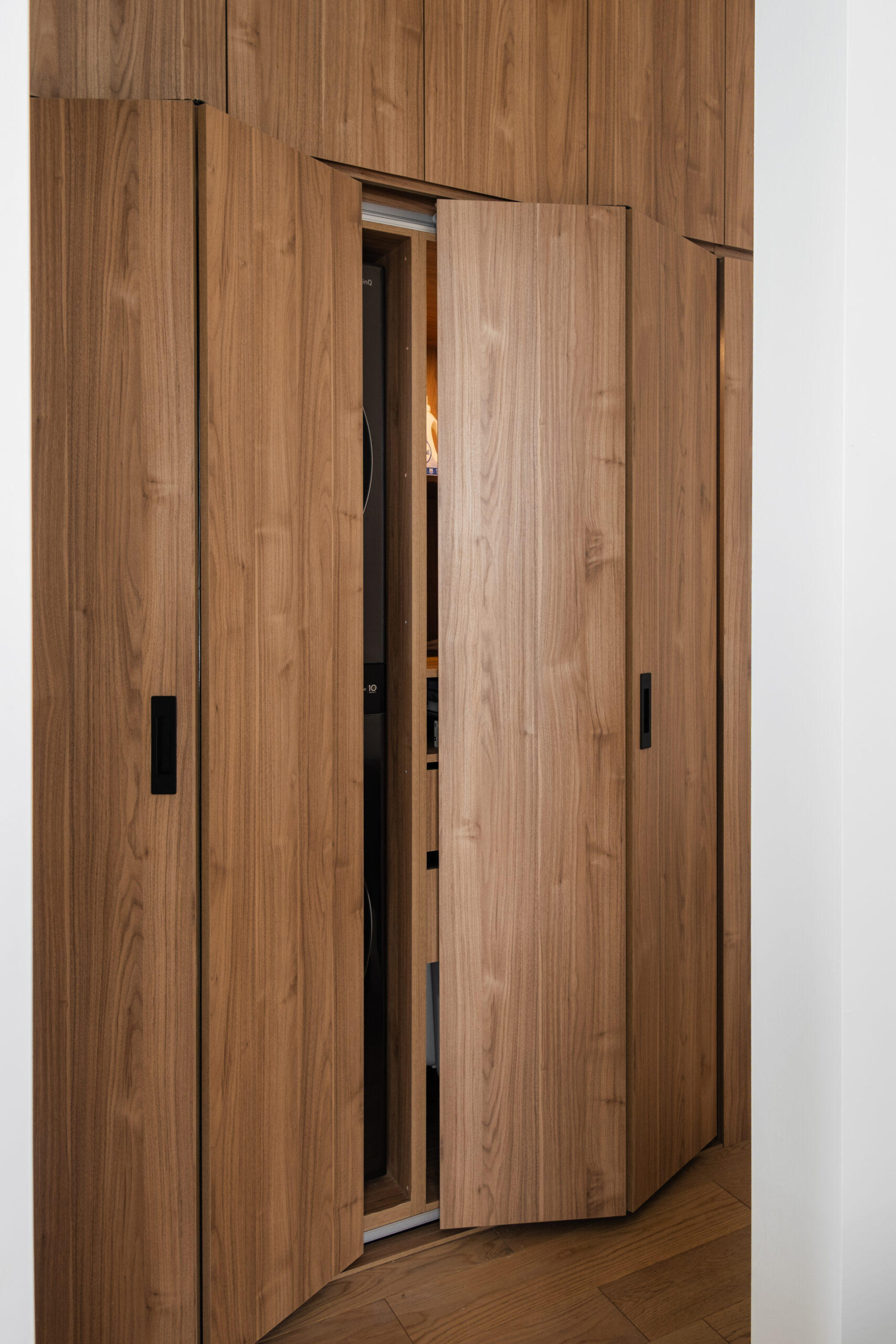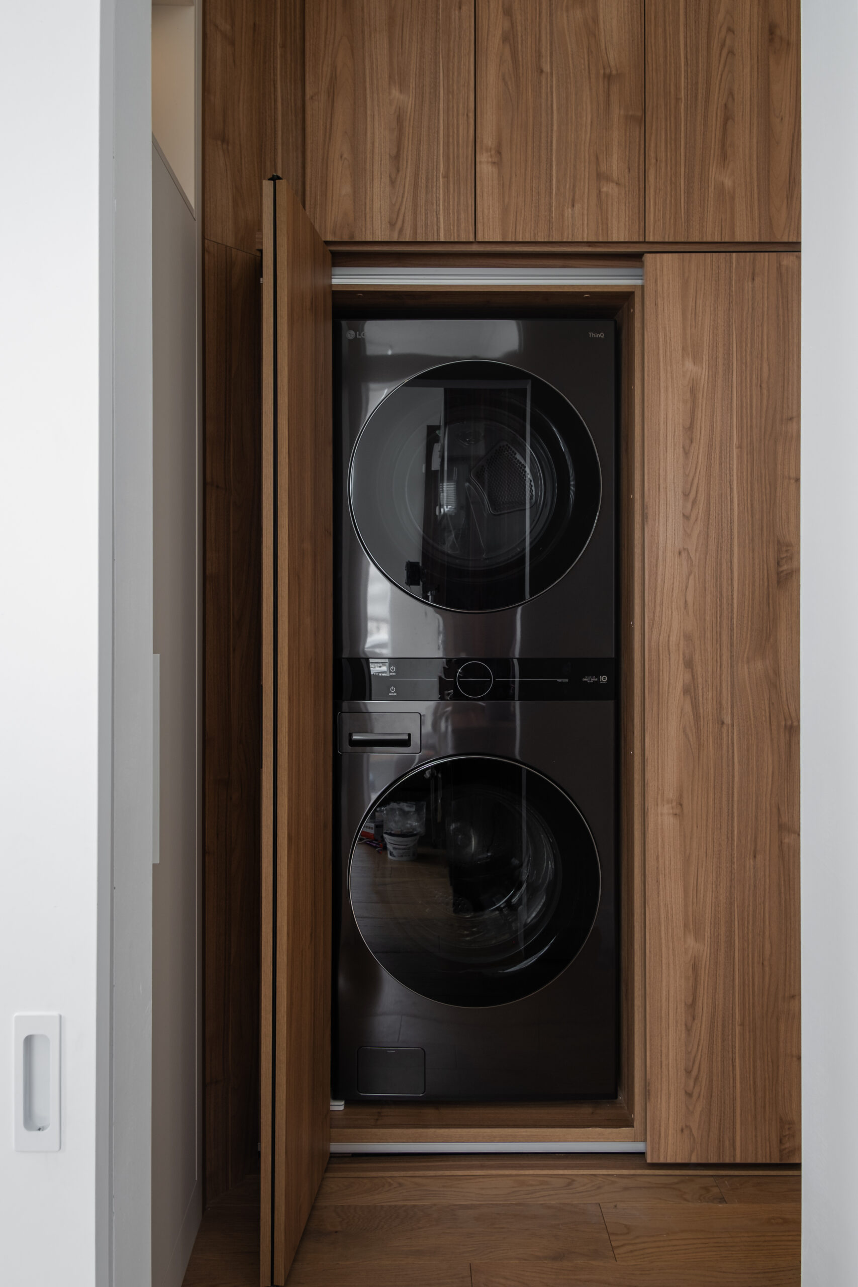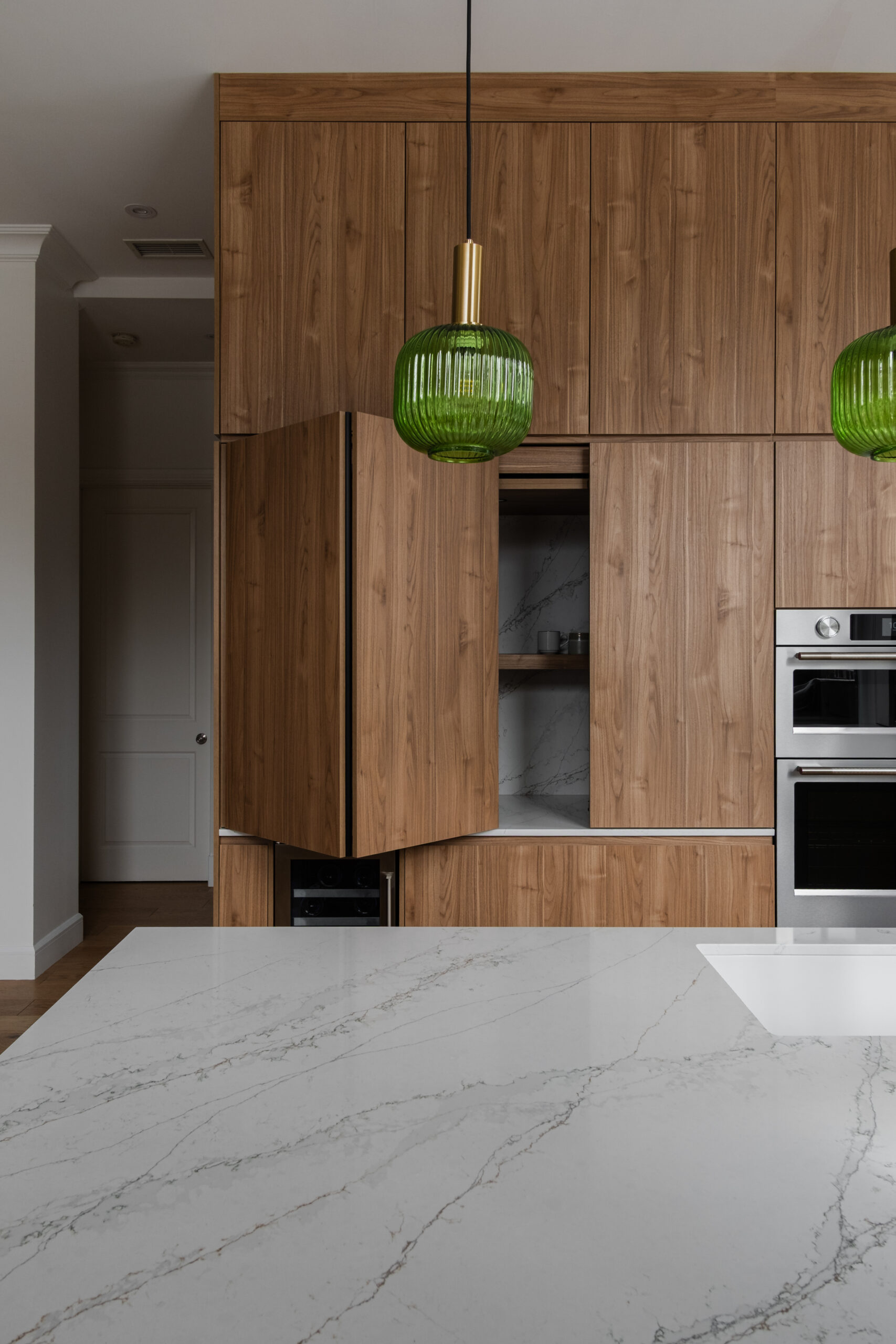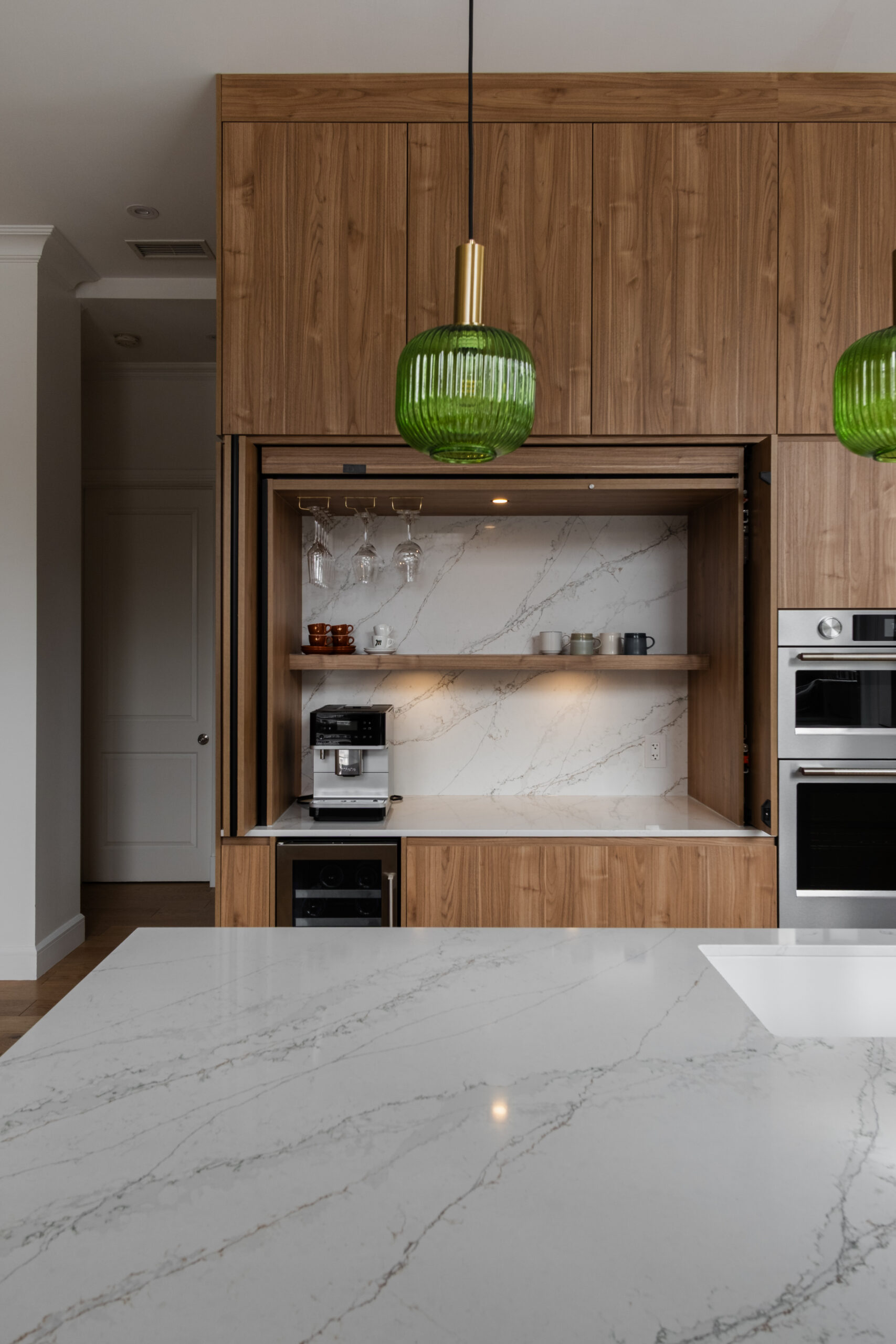 Nous avons entièrement repensé et intégré de façon discrète l’espace cuisine, l’espace salle d’eau et le coin salle de lavage de ce condo afin d’en révéler la pleine volumétrie. Guidées par la hauteur des plafonds et la lumière naturelle, notre conception met en valeur les proportions de cet espace situé dans une ancienne usine à stylos plume, aujourd’hui transformée en condos spacieux. L’ergonomie a été optimisée afin de créer un concept distinctif pour un jeune couple s’installant dans ce quartier animé de Saint-Lambert.