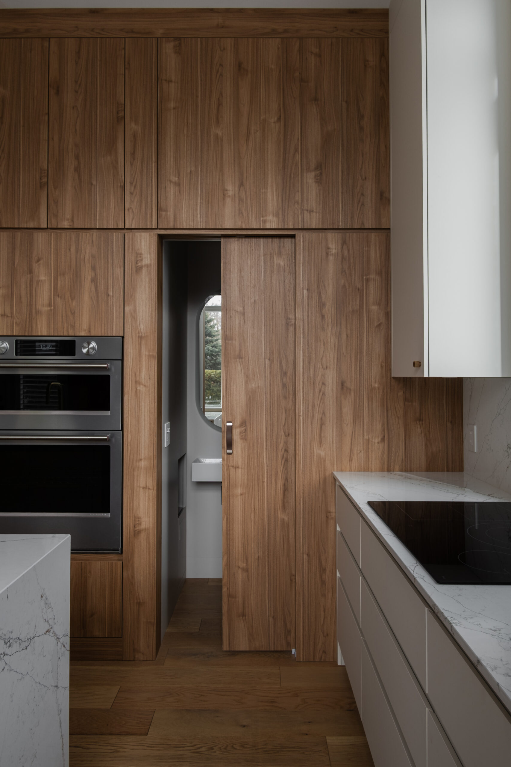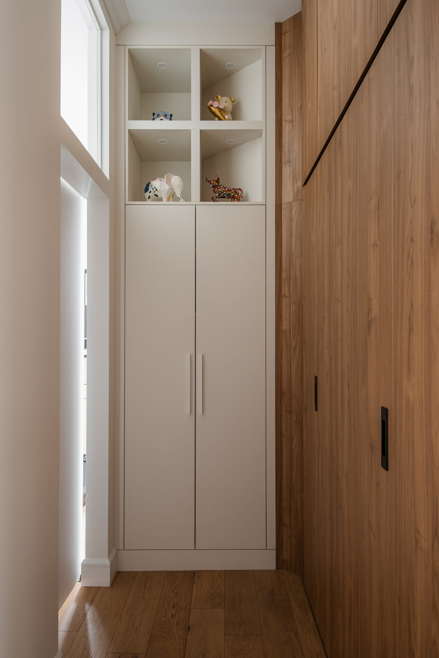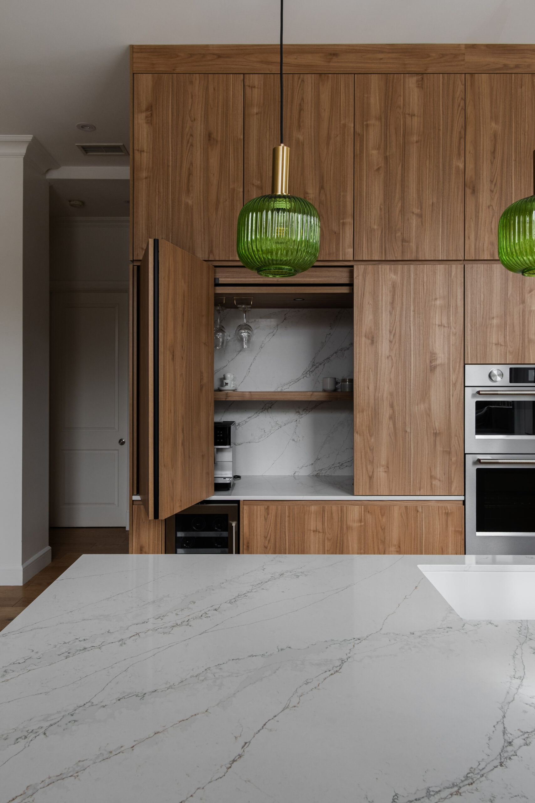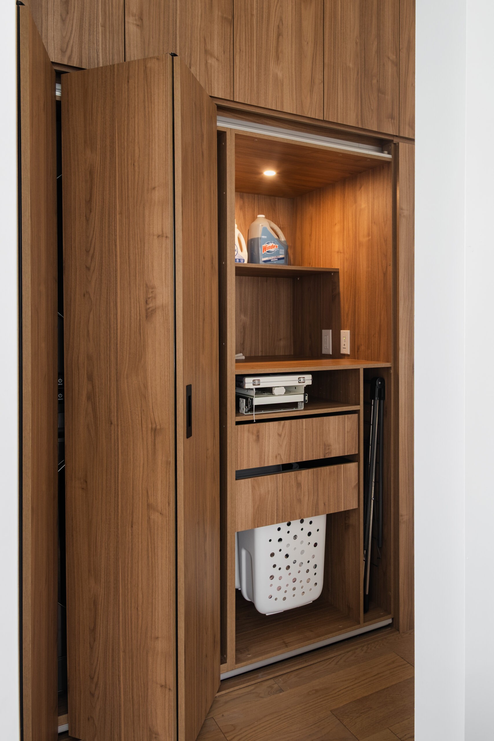 Nous avons entièrement repensé et intégré de façon discrète l’espace cuisine, l’espace salle d’eau et le coin salle de lavage de ce condo afin d’en révéler la pleine volumétrie. Guidées par la hauteur des plafonds et la lumière naturelle, notre conception met en valeur les proportions de cet espace situé dans une ancienne usine à stylos plume, aujourd’hui transformée en condos spacieux. L’ergonomie a été optimisée afin de créer un concept distinctif pour un jeune couple s’installant dans ce quartier animé de Saint-Lambert.